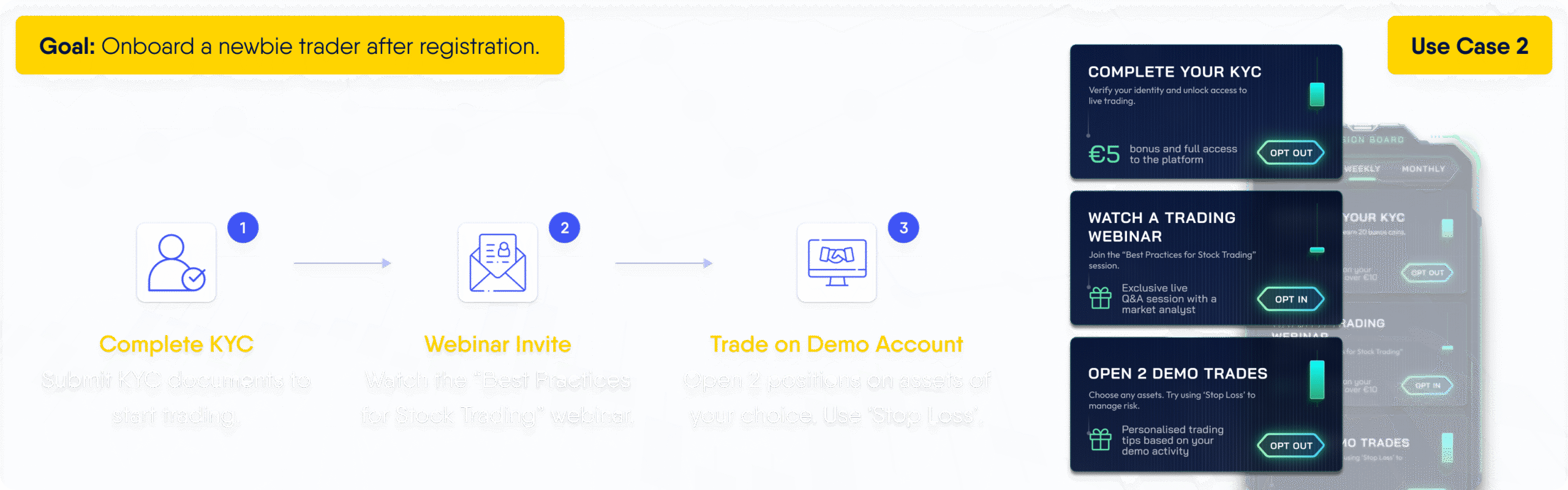 In Trading: Promote consistent activity, encourage portfolio diversification and reward volume-based milestones.