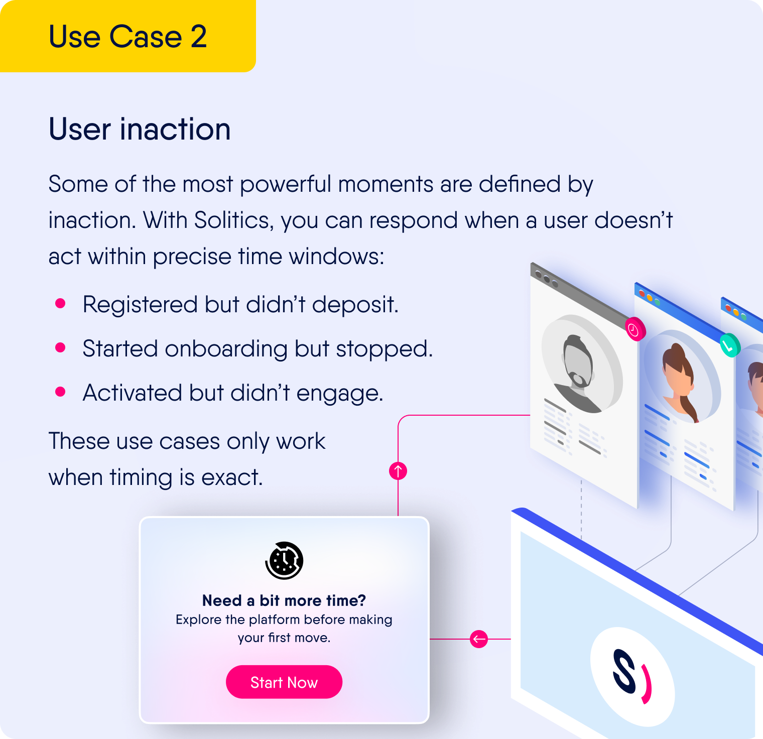 0.8 seconds is how long it takes Solitics to turn a user action into a personalised experience. From the moment something happens to the moment your response appears. End to end.